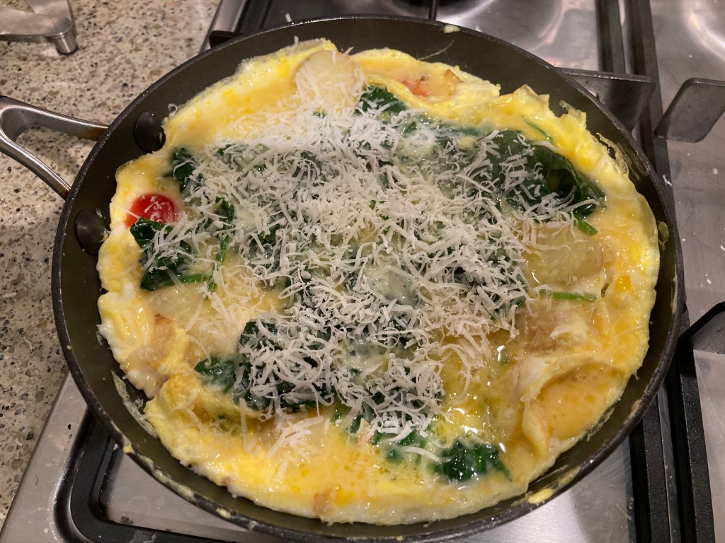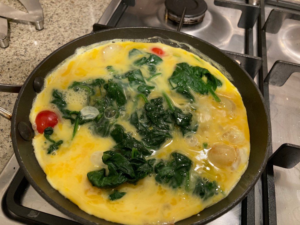 I softened the shallot in a little olive oil, added the potato slices to brown just slightly. I put the halved tomatoes in the pan and then added the cooked spinach. I flattened it all a little with a spatula and then poured in the beaten eggs. I cooked it over a medium heat, lifting the edges of the egg and tipping the pan slightly to let egg run under to the bottom as it all cooked. Meanwhile, I was heating the grill.