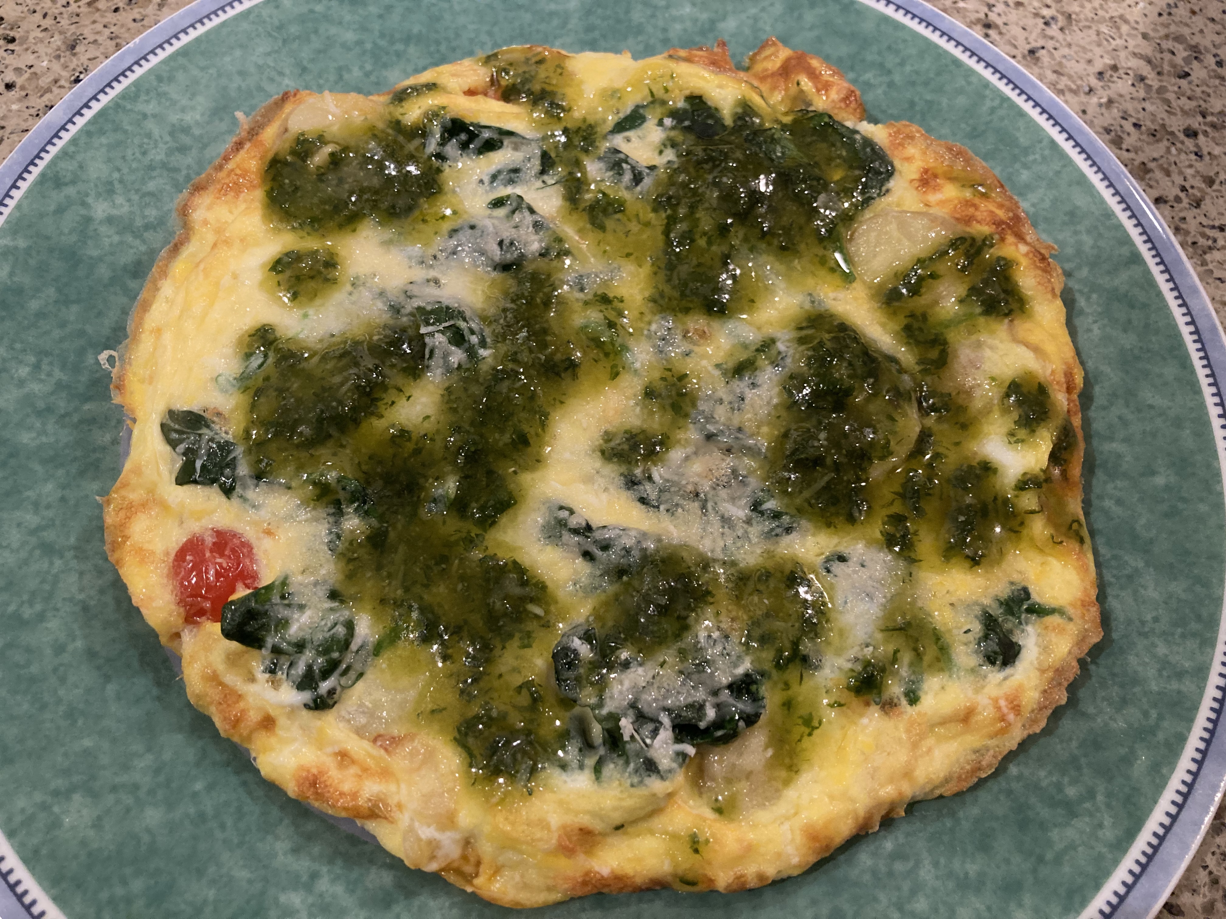Watch it all carefully and once the frittata is nicely browned around the edge, turn it out onto a plate. Then I spooned over the rest of my pesto.