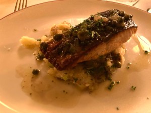 I'd chosen to have the early evening fixed price menu - Prix Fixe - which is £27.50 for 2 courses; £29.50 for 3. I chose to have a main and dessert - as Freddie would. My main was Roasted Salmon Fillet with crushed potatoes, spring onions, capers and beurre noisette. It was delicious! Really good.