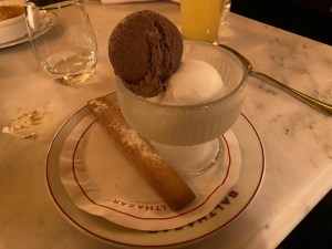 Freddie had a generous portion of ice cream for dessert, which came with a home-made stick of shortbread. I chose Creme Brûlée from the fixed menu. It was excellent - one of the best I've had. Freddie had apple juice to drink and I had a glass of Picpoul.